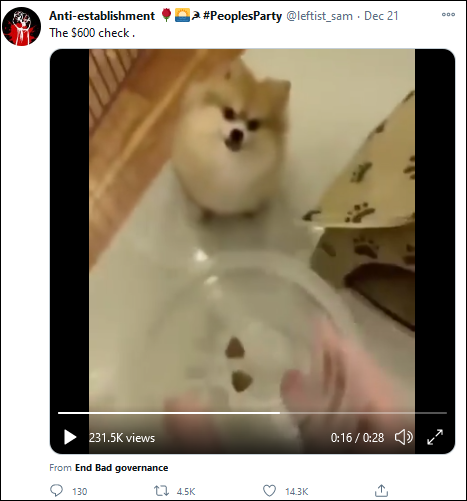 早在12月21日,推特上就有網民對600美元的補貼表達了不滿,形容其簡直是“拿兩粒狗糧在餵狗”。
