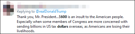 有人在推特上説:“這600美元是對美國人的侮辱。當一些國會成員想着要將數十億美元的税收送往國外時,美國人正在失去生計。”