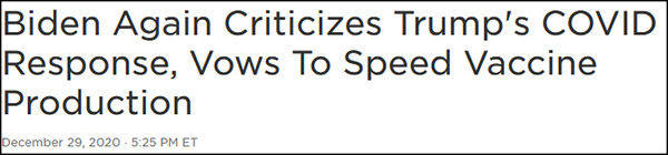 面對嚴峻的疫情,即將上任的拜登政府已經提出新的應對方案。據美國國家公共廣播電台(NPR)29日報道,拜登在當天的演講中宣佈,他計劃上任後引用戰時的國防生產法案,提高美國新冠疫苗產量。