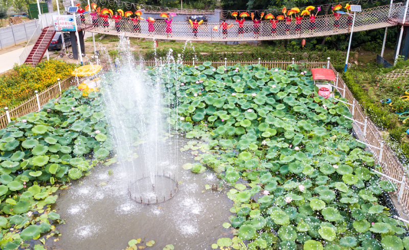 2020年7月14日,河北省饒陽縣王同嶽鎮王同嶽村村民在廢棄坑塘改造的小花園內排練節目。