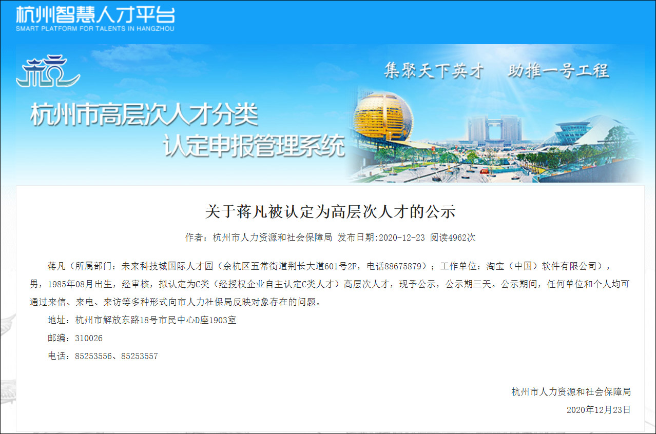 一週前(12月23日),杭州智慧人才平台公示,經審核,擬認定蔣凡為C類(經授權企業自主認定C類人才)高層次人才,公示期三天。