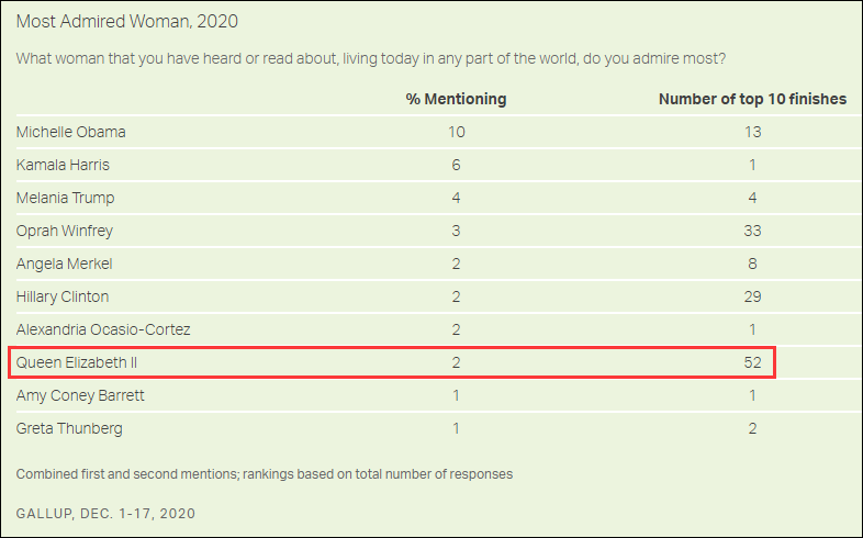 值得一提的是,今年是英國女王伊麗莎白二世第52次入圍這項“最受尊敬女性”民調的前十,這一次數遠遠超過任何其他女性,排在她身後的是撒切爾夫人的34次,以及奧普拉·温弗瑞的33次和希拉里的29次。