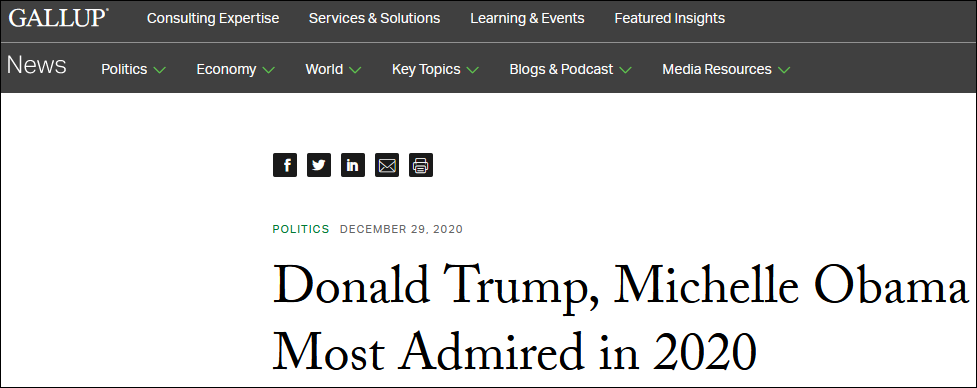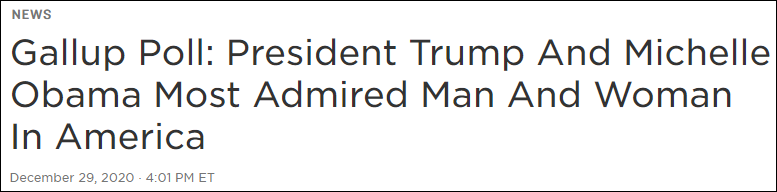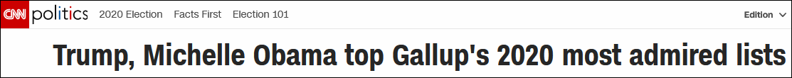 據報道,這是即將離任的特朗普首次在這項民調中獨佔鰲頭,打破了前總統奧巴馬此前連續12年的壟斷。去年,兩人曾並列成為2019年蓋洛普"美國最受尊敬男性"。同時,這也是米歇爾·奧巴馬連續第三年被評為“美國最受尊敬女性”,當選副總統哈里斯則在民調中名列第二。