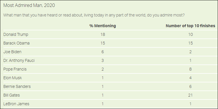 雖然排名靠前的人物通常很容易預測到,但這項民調很大程度上是在政治層面對人物知名度作出一種檢驗。民調的問題其實也非常簡單,即向美國公眾提出一個開放性的問題:“當今世界上你最尊敬的男性和女性是誰”。