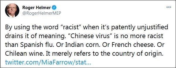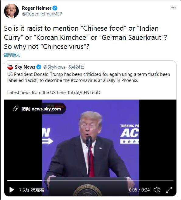 不料,這條評論徹底“翻車”。赫爾默是一名英國獨立黨成員,政治立場偏保守,批評英國的國家醫療服務體系(NHS),並否定歐盟的氣候政策。過去一年間,他曾多次將新冠病毒污衊為“中國病毒”,還曾轉發過特朗普的相關視頻。