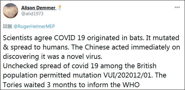 還有一名網友對比稱:“科學家同意新冠病毒起源自蝙蝠,變異後傳播給人類,中國人發現這是一種新病毒後,立即採取了行動。新冠病毒在英國人口中無限制的傳播,導致了變異新冠病毒(VUI/202012/01),保守黨等了3個月才通知世衞組織。”