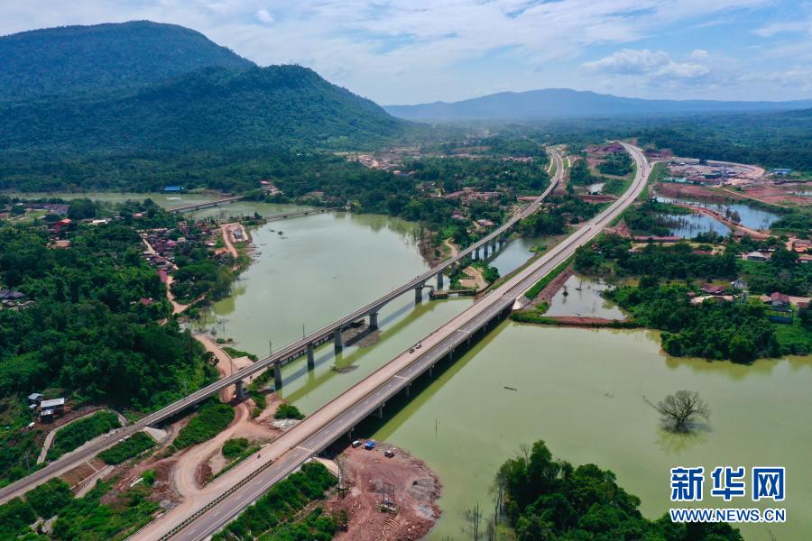 這是10月21日在老撾萬象省航拍的建設中的萬萬高速橋樑(右)和中老鐵路橋樑(左)。新華社發(雲南建投集團供圖)