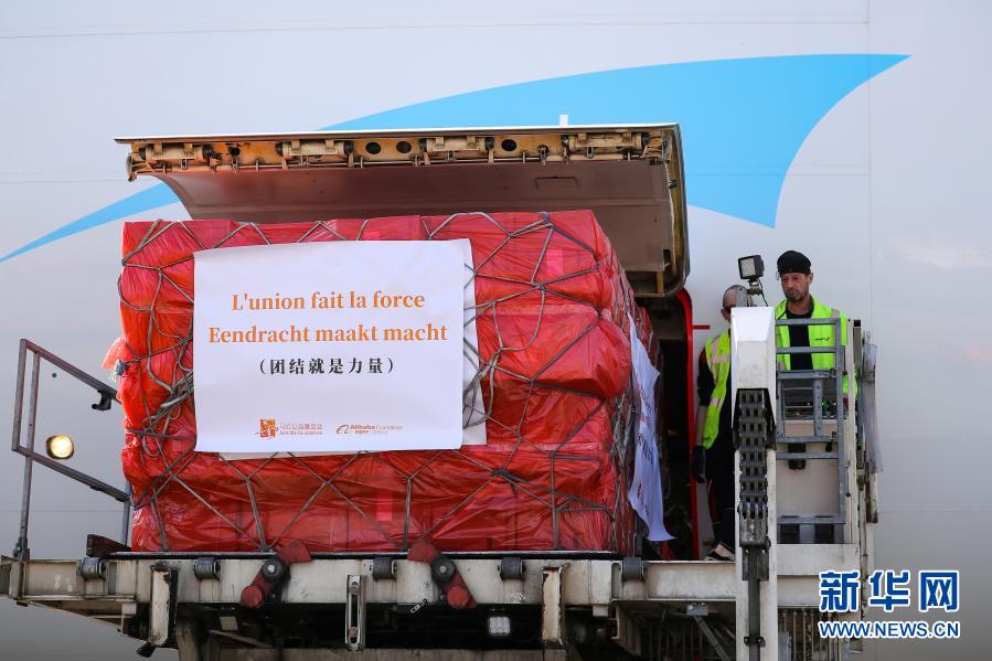 3月16日,在比利時列日機場,工作人員將口罩包裹運下飛機。來自中國的30萬隻口罩當地時間16日中午運抵比利時列日機場。這是歐洲新冠肺炎疫情暴發以來,比利時首次得到大規模外來援助。新華社記者張鋮 攝