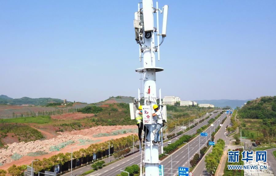 工作人員在位於重慶高新區高新大道的5G基站建設現場作業(4月15日攝,無人機照片)。新華社記者 王全超 攝