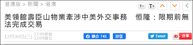 【文/觀察者網 齊倩】今年9月,香港恆隆地產以25.66億港元(約22.63億人民幣)的價格,中標美國駐港澳總領館位於香港南區壽臣山壽山村道37號的物業。該公司透露,該交易定於12月30日中午或之前完成。