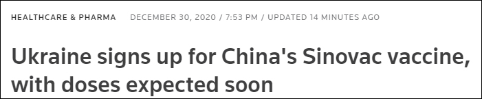 據路透社12月30日報道,烏克蘭總統辦公室當天表示,烏克蘭已簽署合同,購買180萬劑中國科興公司研發的新冠疫苗,並希望在“儘可能短時間”內開展接種。