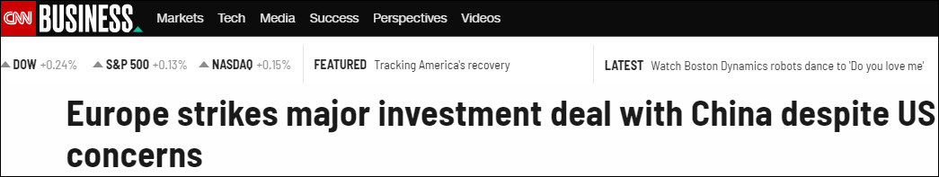 相較於中歐雙方對於協定談判完成的歡欣鼓舞,美國方面所展現出的態度也十分值得玩味,CNN在12月30日就以《不顧美國擔憂,歐洲仍與中國達成重大投資協定》為標題作出了報道。