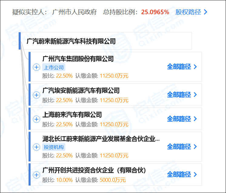 啓信寶信息顯示,廣汽蔚來成立於2018年4月,註冊資本5億元,法定代表人為李斌,疑似實控人為廣州市政府,股東包括湖北長江蔚來新能源產業發展基金合夥企業(有限合夥)、上海蔚來汽車有限公司、廣州汽車集團股份有限公司、廣州開創共進投資合夥企業(有限合夥)、廣汽新能源汽車有限公司。