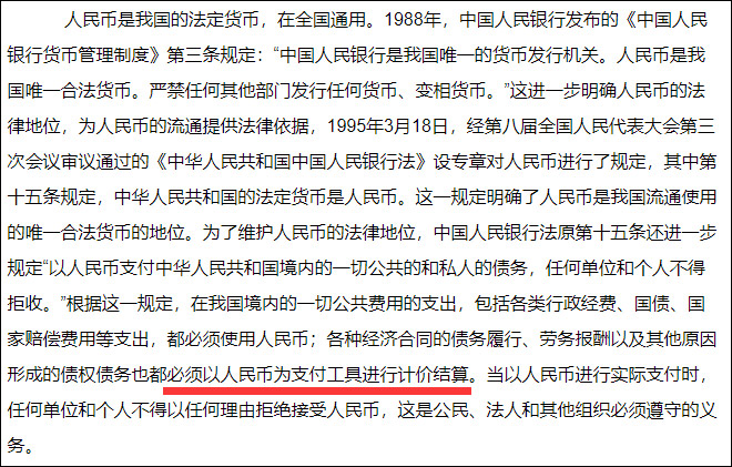 而中國人大網發佈的《 中華人民共和國中國人民銀行法釋義》中指出,中國人民銀行是我國唯一的貨幣發行機關。人民幣是我國唯一合法貨幣。嚴禁任何其他部門發行任何貨幣、變相貨幣。