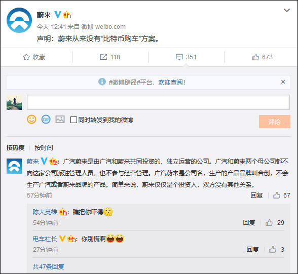 針對此事,蔚來汽車在官方微博表示:該公司從來沒有“比特幣購車”方案。