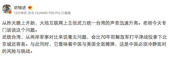 從昨天晚上開始,大陸互聯網上主張武力統一台灣的聲音迅速升高。老胡今天專門談談這個問題。