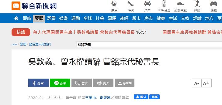環球網記者注意到,在“中時電子報”發佈這一消息稍早,曾有台媒稱,國民黨副主席曾永權代理黨主席。不過,台灣《聯合報》稱,由於副主席也請辭,無人可以代理主席,僅曾銘宗代理秘書長。