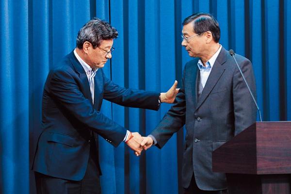國民黨15日召開選後首次中常會,推舉中常委林榮德(左)代理黨主席,“立院”黨團總召曾銘宗(右)暫代秘書長。(圖片來源:台灣“中時電子報”)