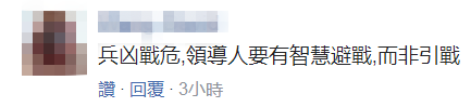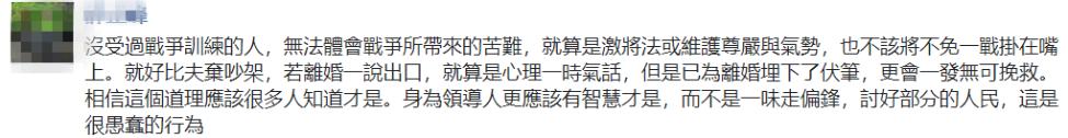 有網友表示,“沒受過戰爭訓練的人,無法體會戰爭所帶來的苦難,就算是激將法或維護尊嚴與氣勢,也不該將不免一戰掛在嘴上。相信這個道理應該很多人知道才是。身為台灣地區的領導人更應該有智慧才是,而不是一味走偏鋒,討好部分的人民,這是很愚蠢的行為。”