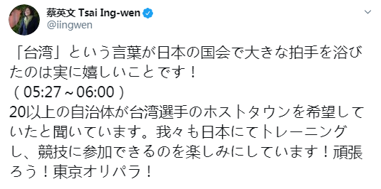 蔡英文在推特上這樣寫道:“‘台灣’一詞在日本國會得到掌聲,真是太開心了!(05:27~06:00)聽説日本有20個以上的自治體希望接待台灣選手。我們也將加強訓練,期待參加比賽!加油!東京盛會!”