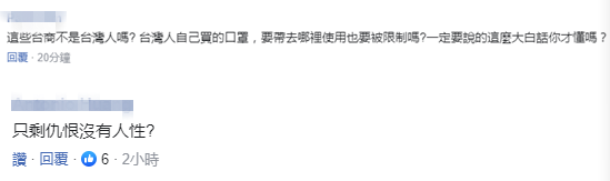 還有網友質問,“這些台商不是台灣人嗎? 台灣人自己買的口罩,要帶去哪裏使用也要被限制嗎?”“只剩仇恨沒有人性”。
