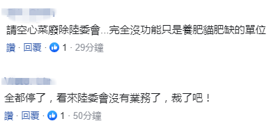 7日,台當局暫停“小三通”的消息傳出後,島內網友留言酸諷:“全都停了,看來陸委會沒有業務了,裁了吧!”“小三通,大三通,ECFA…通通都中止,不!通通都終止。台灣,就關起門來做皇帝,法菜吃吃,紅酒喝喝,A8飆飆,軍公砍砍,鎖島封官小日子,雞腸鳥肚小雀幸。”“請空心菜廢除陸委會…完全沒功能,只是養肥貓肥缺的單位”。
