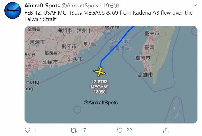 【環球網報道 記者 徐璐明】根據長期跟蹤美軍戰機動態的推特賬號“飛機守望”(Aircraft Spots)2月12日提供的飛行路線顯示,兩架隸屬於美國空軍的MC-130J特種作戰飛機當天從日本嘉手納空軍基地起飛,飛越台灣海峽上空,之後去向不明。