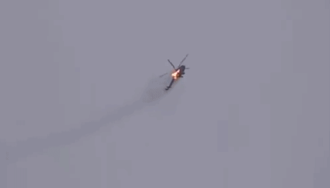 報道稱,這架直升機當時正在執行作戰任務,飛機是被”征服沙姆陣線“恐怖主義組織分子擊落的。在國外社交媒體上,也出現了一段據稱是敍利亞政府軍直升機被擊落墜毀瞬間的視頻。從畫面上看,被擊落的疑似一架米-17(或米-8)運輸直升機。