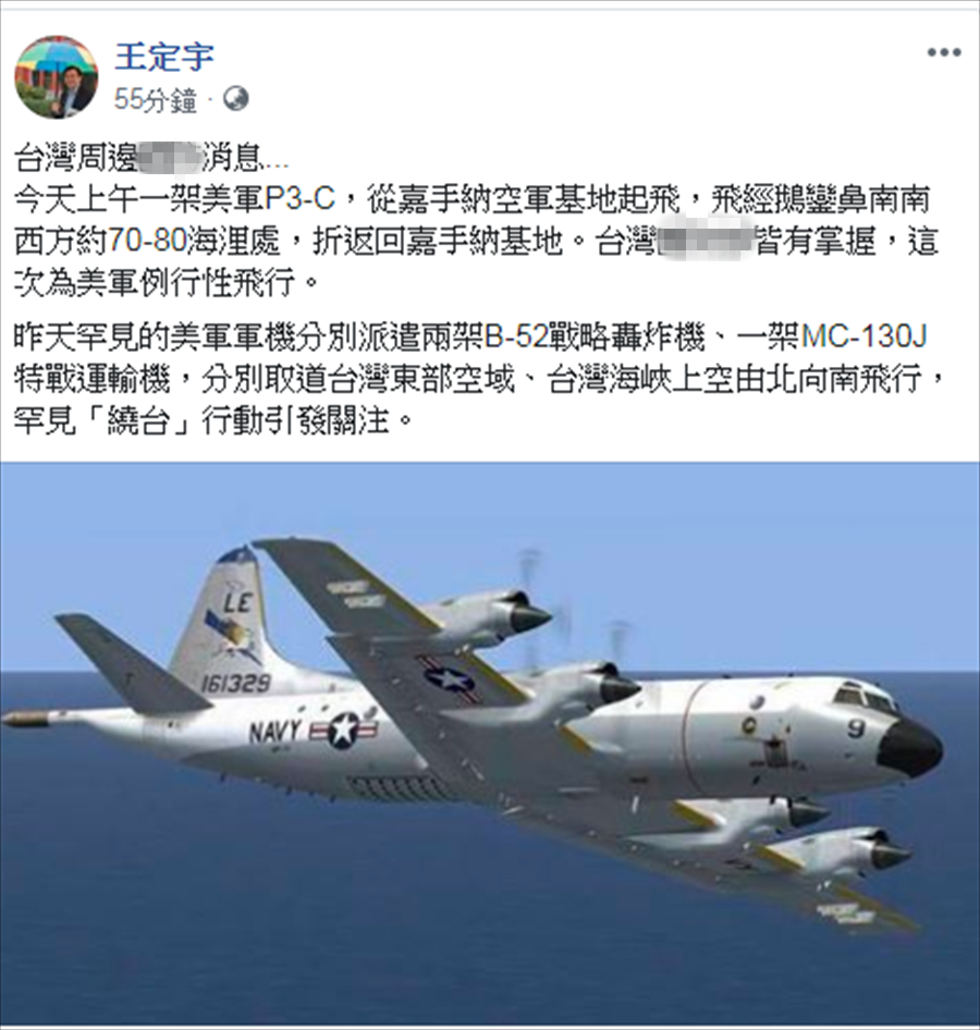 王定宇稱,13日上午一架美國海軍P-3C型機,從日本嘉手納空軍基地起飛,飛經鵝鑾鼻南南西方約70-80海浬處,折返回嘉手納基地。