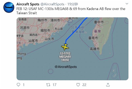 12日,根據長期跟蹤美軍戰機動態的推特賬號“飛機守望”(Aircraft Spots)提供的飛行路線顯示,兩架隸屬於美國空軍的MC-130J特種作戰飛機當天從日本嘉手納空軍基地起飛,飛越台灣海峽上空,之後去向不明。