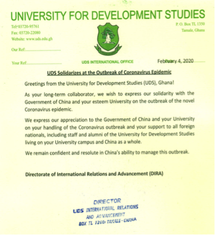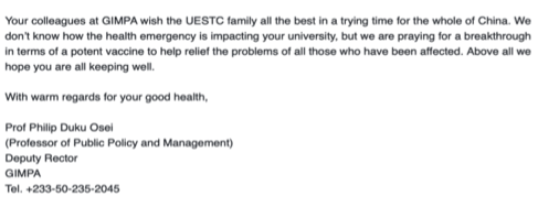 中心成員單位加納發展大學以及加納行政管理學院副校長Philip Duku Osei發來了慰問信函。加納發展大學表示:“我們感謝中國政府與電子科技大學在應對疫情方面所付出的努力,包括對在中國及貴校的外國公民的關心與支持。我們對中國控制疫情的能力有絕對的信心和決心。”