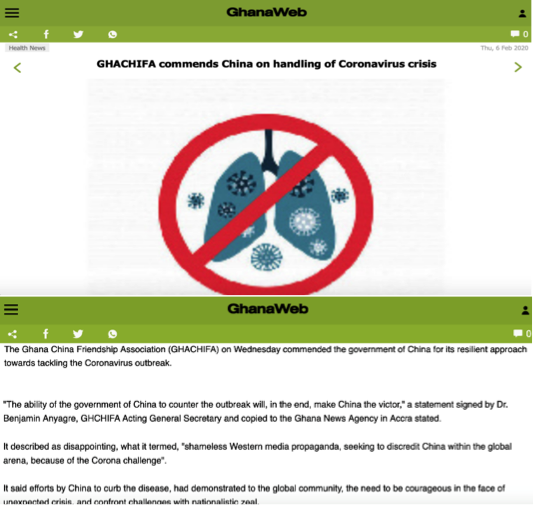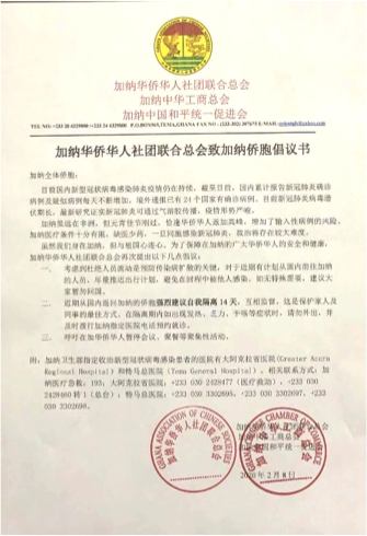 2月6日,加納-中國友好協會(GHACHIFA)在加納新聞網頁上讚揚了中國政府為應對冠狀病毒爆發而採取的有力措施。GHACHIFA代理秘書長本傑明·安雅格(Benjamin Anyagre)博士簽署並抄寫給阿克拉加納通訊社的評論中説: “中國政府抵抗疫情的能力最終將使中國成為勝利者。我們與中華人民共和國並肩站立,我們的口號是‘發展中的團結’”。2月8日,加納華僑華人社團聯合總會、加納中華工商總會與加納中國和平統一促進會共同發表倡議,為赴加納的華僑華人提供抗疫指導,並表示全球華人必須同全體國人站在一起並肩作戰,共克時艱,齊心抗疫。