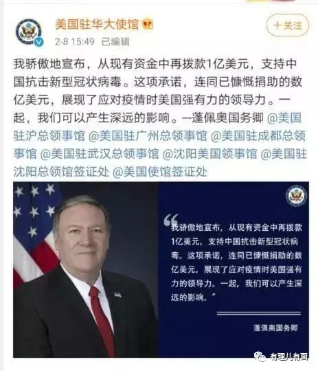 蓬佩奧在前幾天的記者會上表示,美國將撥款1億美元幫助中國抗疫。幾天過後,美元始終沒見影。在美國務院的記者會上,發言人就這筆款項的落實卻不小心説出了真相,蓬佩奧口中的1億美元只是個“上限”,不只是中國,所有被疫情影響的國家都會得到援助。並且在其後公佈的預算中,人們發現“疫情”也不單指新冠肺炎,並首先是用作增強美國自身防控,其次才是國際合作。蓬佩奧自己撒了一個誇大事實的謊,又被自己人實力打了臉。