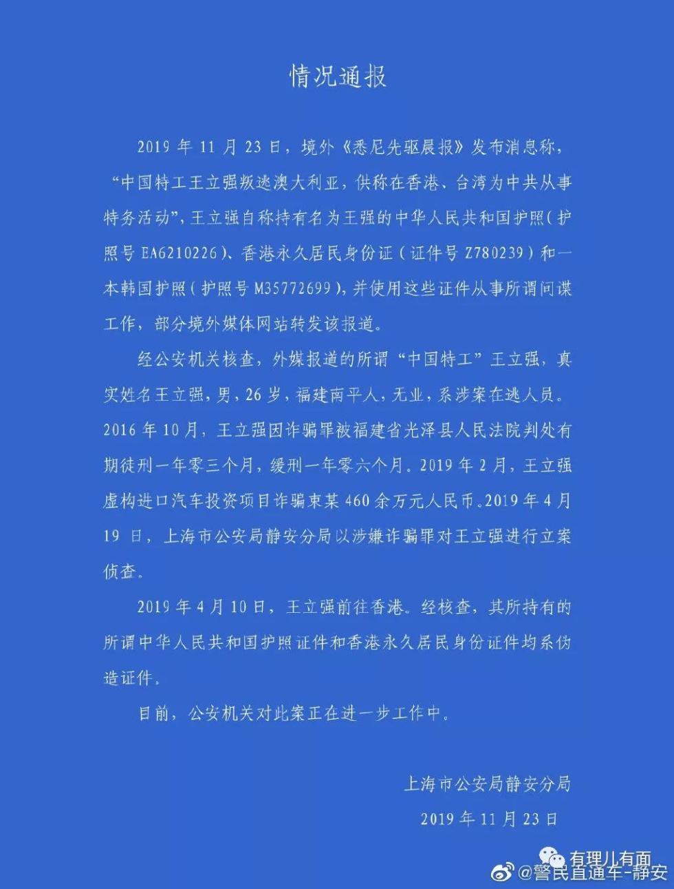 去年4月初,發現被騙的束某到上海市公安局報案,舉報王立強和妻子的詐騙行為。2019年11月23日在澳大利利亞媒體曝出王立強自稱“中國特工”去澳尋求庇護後,上海警方發佈了情況通報稱“2019年2月,王立強虛構進口汽車投資項目詐騙束某460餘萬元人民幣。2019年4月19日,上海市公安局靜安分局以涉嫌詐騙罪對王立強進行立案偵查。”