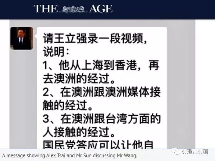 據報道,王立強還收到蔡和孫提供的劇本和指令:錄製、發表一段視頻,指控是台灣的民進黨給了他“一大筆錢”讓他在特工的事情上説謊。如果按指令行事,他將可以返回中國或者台灣,並得到經濟好處。但是,如果不照辦,他將被遣返中國面對死刑,甚至可能會在澳大利亞受到報復。