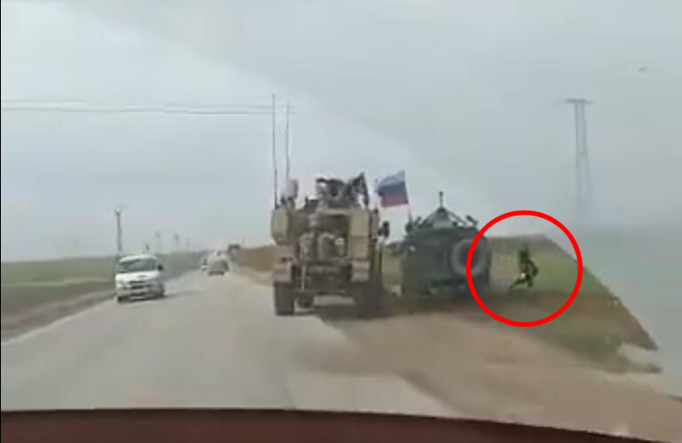 美俄裝甲車在敍利亞公路鬥氣別車險些撞到路人