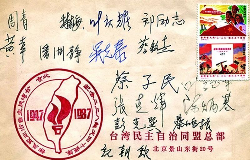 ——1987年,部分“二·二八”親歷者相聚在台盟總部機關,在一張《紀念台灣省人民“二·二八”起義四十週年1947-1987》紀念封上鄭重地簽下姓名併合影留念,從青絲到白首,赤子之心始終不變。
