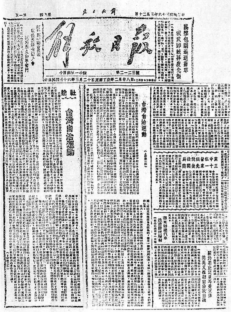 1947年3月20日《解放日報》以社論形式發表中共中央聲援“二·二八”起義文章