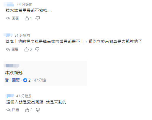 對於陳柏惟的荒謬言論,有島內網民諷刺,這水準當里長都不夠格,沐猴而冠,就是來亂的。↓