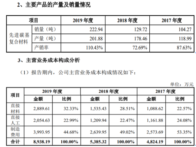 在此基礎上,根據招股書第228頁披露的數據顯示,金博股份在2017年到2019年結轉的直接材料成本金額合計僅為5500萬元,相比採購的碳纖維金額少了2200萬元左右,大致相當於結轉直接材料成本的40%。