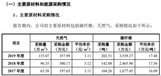 不僅如此,根據招股書披露,金博股份的產品生產所需主要原材料就是碳纖維,外加填隙用的甲烷,2017年到2019年的碳纖維採購金額合計高達7700萬元左右。