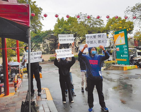 台當局“交通部長”林佳龍14日至台中市東區視察,場外示威人士高舉“中火要開火了,中部(台灣中部)人要火了!”標語抗議。(圖片來源:台灣“中時電子報”)
