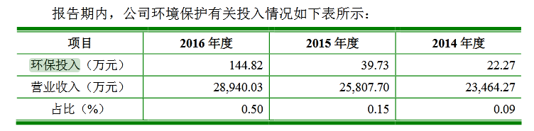 變來變去的不僅僅是募投項目的總投資,還有環保投入等一系列數據。招股書顯示,2016年,公司環保投入為265.83萬元,佔營收的0.92%。但這一數據與公司之前的招股書截然不同。2017年,公司計劃主板上市,曾發佈過一版招股書,彼時,招股書稱,2016年,公司環保投入僅144.82萬元。同一數據,兩種説法,誰真誰假,不得而知。