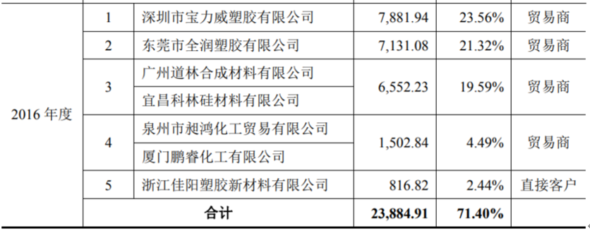 根據招股書披露,在美瑞新材的主要客户中,貿易商類客户和直客分別大約佔到一半的比例,但是在前五大客户中,貿易商就佔到了4席,擁有絕對領先優勢。該公司的主要貿易商客户中包括有泉州市昶鴻化工貿易有限公司與廈門鵬睿化工有限公司,這兩家公司為同一自然人於海鵬負責與公司的業務,兩家公司合計在2016年向美瑞新材採購了1502.84萬元商品,並位列第4大客户。