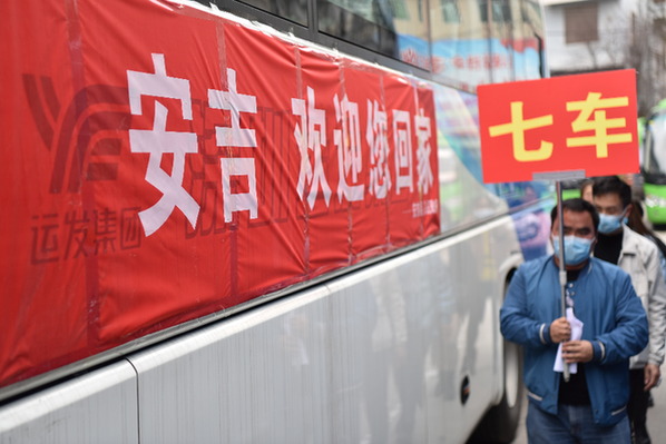 2月26日,在貴州省丹寨縣客車站,外出務工人員乘坐“返崗專用車”前往浙江省安吉縣。
