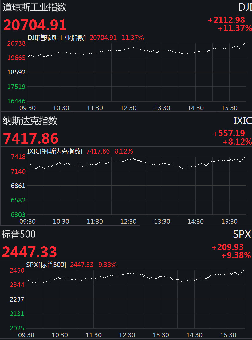 截至收盤,道指漲2112.98點,漲幅11.37%,報20704.91點;納指漲557.19點,漲幅8.12%,報7417.86點;標普500指數漲209.93點,漲幅9.38%,報2447.33點。