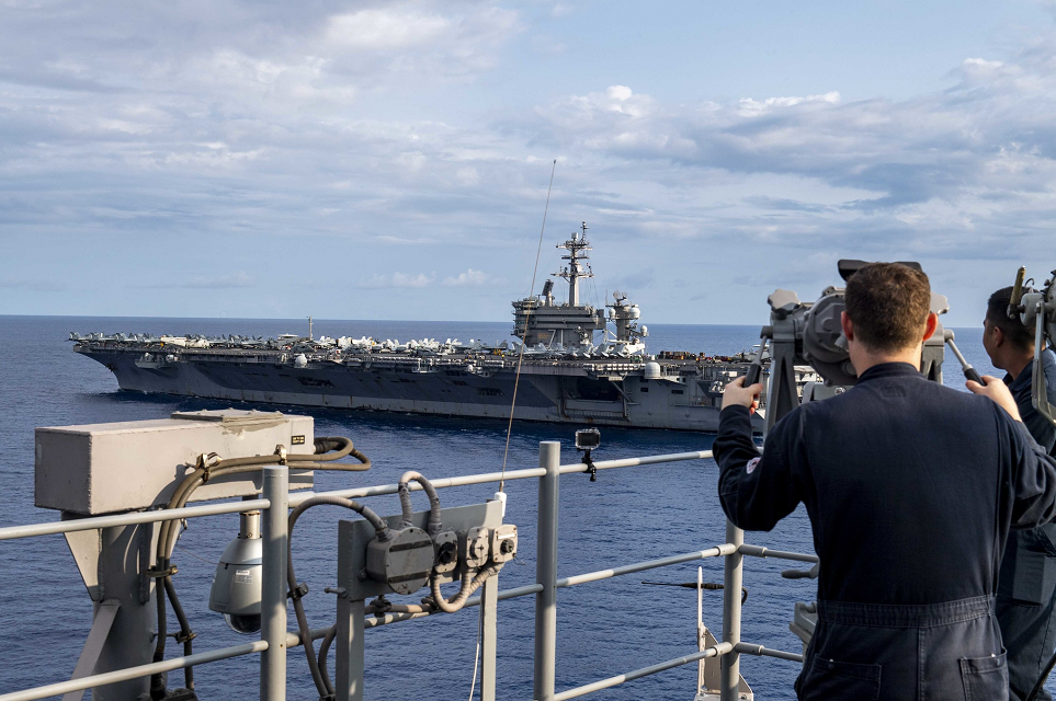 在3月10日結束對越南訪問後,“羅斯福”號航母奔着南海方向前進,並於3月15日與“美利堅”號兩棲攻擊艦、“綠灣”號兩棲船塢登陸艦等多艘艦船在南海開展聯合演練。演練後“羅斯福”號駛出南海海域,抵達菲律賓海,3月17日進行了一次海上橫向補給,3月18日又與來自美國空軍第69遠征轟炸機中隊的B-52H轟炸機以及美國空軍的F-15C戰鬥機進行了聯合演練。