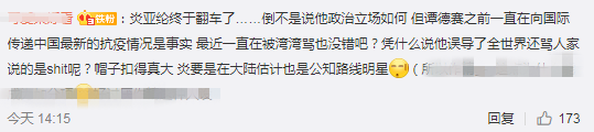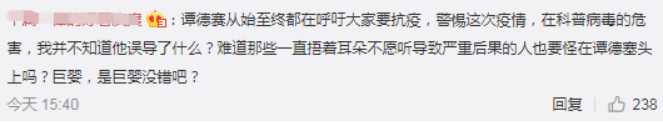 但還有大陸網民稱,譚德賽從始至終都在呼籲大家要抗疫,警惕這次疫情,在科普病毒的危害,我並不知道他誤導了什麼?難道那些一直捂着耳朵不願聽導致嚴重後果的人也要怪在譚德塞頭上嗎?↓