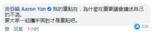 時隔近2小時,今天下午14時16分,炎亞綸在該條貼文的評論區留言解釋説,“我的重點在,為什麼在重要議會講述自己的不滿。要大家一起攜手面對才是重點吧。”↓