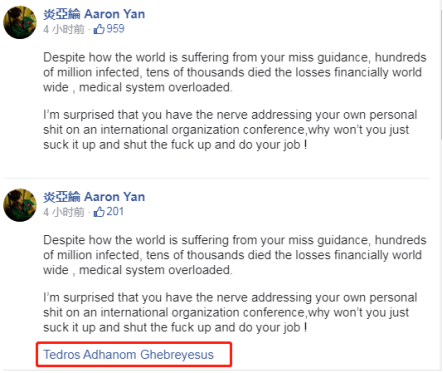 今天(9日)中午12時33分,炎亞綸在其臉書以英文指責譚德塞“誤導”世界,還指責稱“你竟然有勇氣在一次國際組織會議上發表你自己個人的屎一樣的言論”,“你為什麼不乾脆閉嘴、閉上你的臭嘴,做好自己的工作!”同時附上了譚德塞臉書的鏈接,隨後他又對貼文進行編輯,去掉了此鏈接。